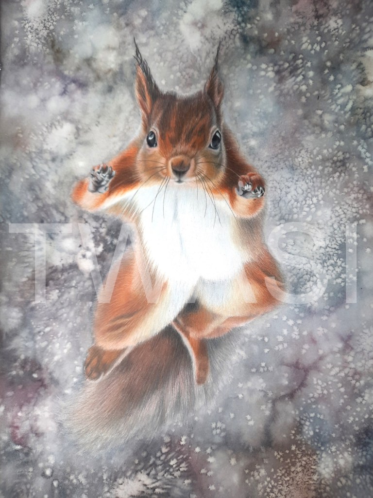 “Caroline had seen on the British Wildlife Photography website this photograph of a gorgeous red squirrel leaping, and instantly wanted to paint it, as she adores red squirrels.