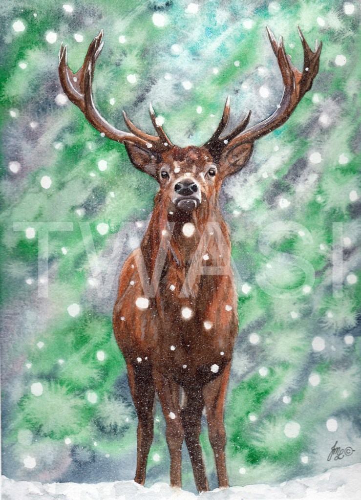 The stag is painted in more detail, to give him solidity and presence in the swirling blizzard conditions.”